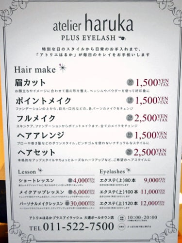 アトリエ はるか ポール タウン-「アトリエはるか」はヘアセット&メイクアップの専門店。 プロのサービスが短時間でリーズナブルに、 あなたの前向きな気持ちとキレイをサポートいたします! お客様に安心してご利用頂けるよ北海道札幌市中央区南4条西4丁目さっぽろ地下街ポールタウン内 営業時間 1000~00(土日祝時間外800~承ります※要予約) 定休日 さっぽろポールタウンに準ずる スタイリスト 総数4人(施術